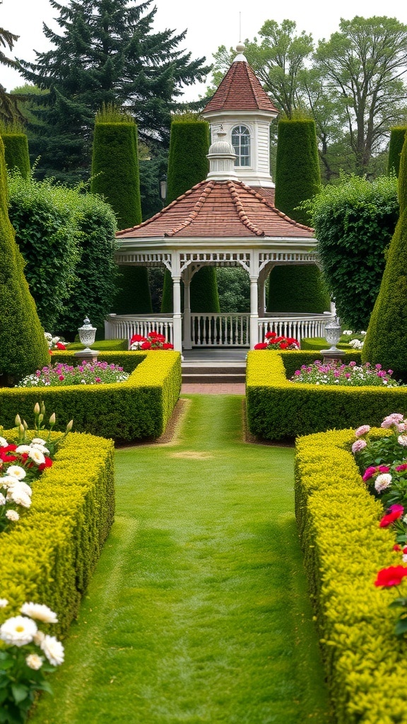 A Victorian formal garden is a stunning way to create a themed outdoor space that feels both timeless and elegant. This style is characterized by its symmetrical layout, neatly trimmed hedges, and vibrant flower beds. The image showcases a beautiful gazebo surrounded by lush greenery and colorful blooms, inviting you to step into a serene retreat.