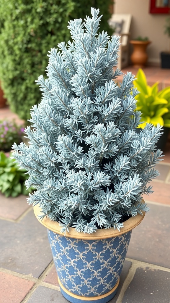 In the image, you can see a Blue Star Juniper in a decorative pot, showcasing its vibrant color and unique texture. This plant can easily enhance your garden’s appeal throughout the year, adding a touch of elegance to your outdoor space.